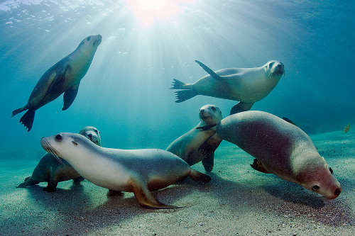 Những con sư tử biển Úc bên bờ tuyệt chủng, đang bơi lội trong một vùng biển.