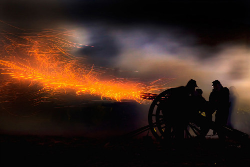Những người lính đang đứng cạnh một khẩu pháo đang phát hỏa.