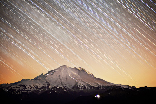 Hình ảnh này chụp trong gần 6 giờ và dưới bầu trời đầy sao. Sương mù liên tục ở mức độ thấp, gây ra ánh sáng màu đỏ nhìn thấy trên bầu trời và các vệt sáng do các vì sao để lại. Ánh sáng từ Mặt Trời Mọc có thể được nhìn thấy ở phía dưới bên phải của hình ảnh.