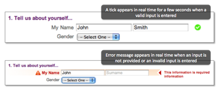 (Chú thích trong khung đen) [Dấu tick xuất hiện vài giây khi nhập đúng thông tin; Thông điệp báo lỗi hiện lên khi nhập thông tin bị sai hoặc không cung cấp thông tin]