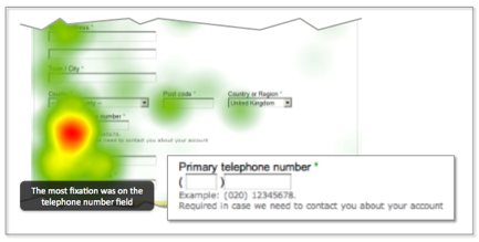eBay có hai ô trống dành cho số điện thoại, bao gồm một mã quốc tế. Mặc dù có một thí dụ được đưa ra ở bên dưới ô trống, nhưng nó cũng không hẳn rõ ràng lắm khi điền số điện thoại vào trong ô. Như được đưa ra ở trong bản đồ nhiệt độ dành cho eBay ở Figure 7, các điểm màu đỏ hay “điểm nóng” cho biết người dùng nhìn nhiều nhất vào ô “số điện thoại”.