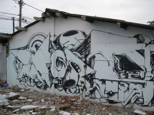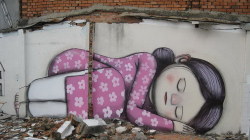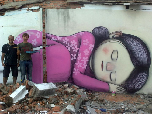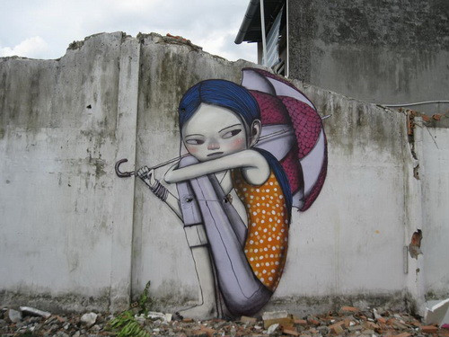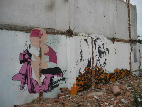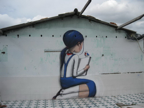 Theo người dân địa phương, nhữngngày qua có "ông Tây" đem màu tới tô điểm lênbức tường trống những hình ảnh dễ thương, vui mắt. Có những bức như lập thể, trừu tượng hay Graffiti… tô điểm cho khung cảnh đỡ buồn tẻ.